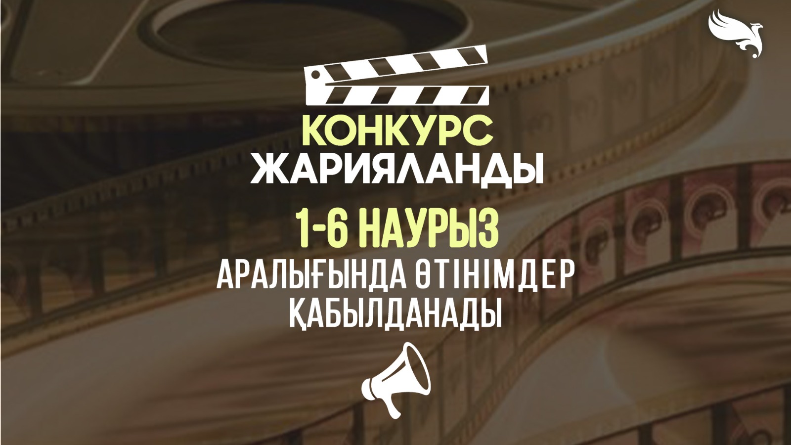1 наурызда Қазақстанда мемлекеттік қаржылық қолдауға үміткер киножобаларды конкурстық іріктеудің бірінші кезеңіне құжаттар қабылдау басталды. Конкурс Қазақстан Республикасы Мәдениет және ақпарат министрлігінің қолдауымен Ұлттық киноны қолдау мемлекеттік орталығымен өткізіліп, ұлттық кинематографияны дамытуға, отандық авторларды қолдауға, сондай-ақ әлеуметтік және мәдени маңызы бар фильмдер түсіруге бағытталған. Өтінімдерді қабылдау 6 наурызды қоса алғанда, Астана уақыты бойынша 23:59-ға дейін жалғасады.